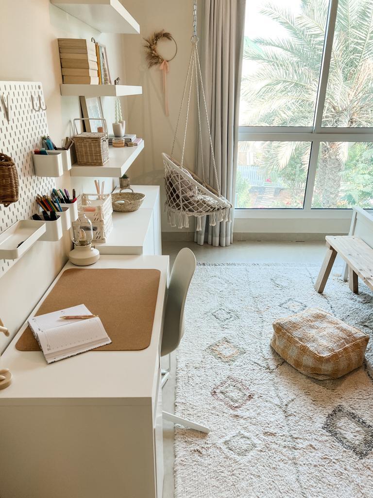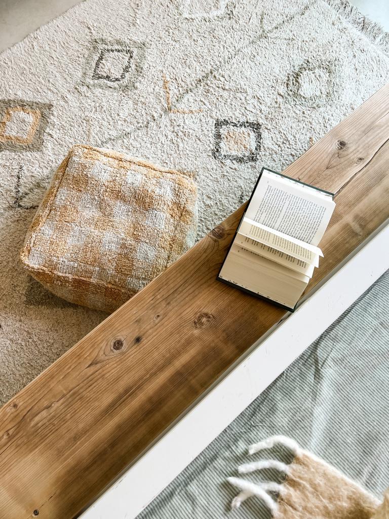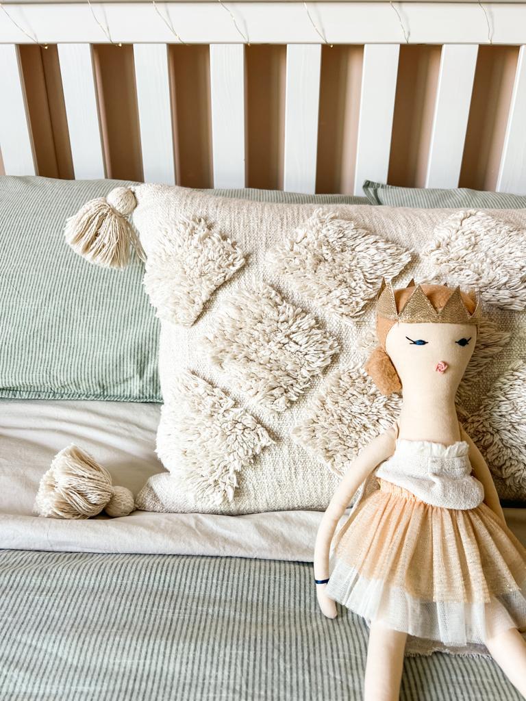 “Naturally, soothing pastel tones are perfect for bedrooms, and when I’m designing a room I like to have a key piece that I work around pulling colour and inspiration from, so when I spotted the new Lorena Canals rug on Harri & Eve I knew this would be my starting point. Not only is it washable, which is perfect for spaces of high traffic and children but it also brings texture and warmth to the room (whilst covering those ugly floor tiles!).”