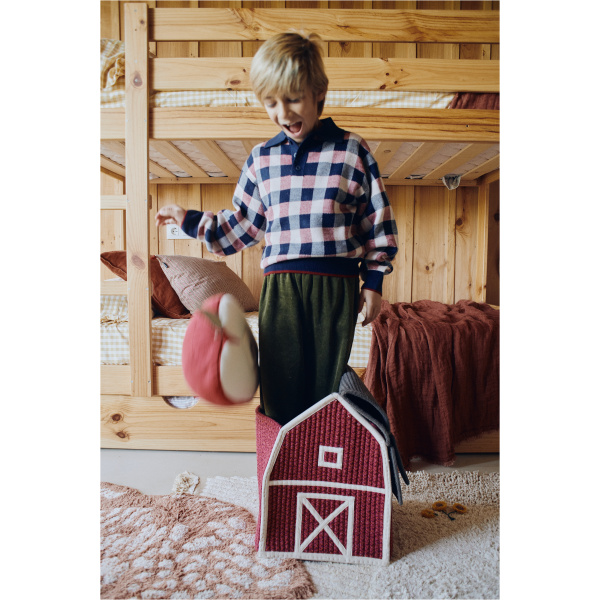 Welcome to the farm! This handcrafted basket, inspired by a farmhouse, features a lid that opens from one side, resembling a barn roof. With its spacious interior, it’s perfect for storing toys or blankets. Made from cotton cords and filled with recycled polyester from PET bottles, this basket combines sustainable materials with countryside style, offering both decorative appeal and practical storage to any kids’ room.