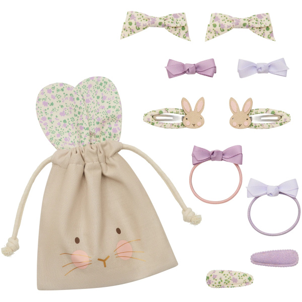 Looking for a thoughtful Easter gift without the sugar rush? This adorable bunny pouch with floral print ears filled with ten beautiful hair accessories makes a delightful springtime gift that’s sure to bring a smile!