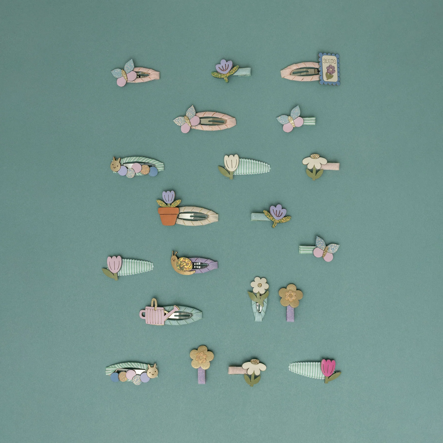 • Caterpillars and butterflies crafted from a mix of glitter, metallic and soft leatherette fabrics